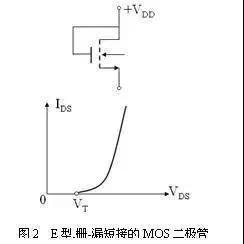 【答】這種集成MOS二極管的連接方式及其伏安特性如圖2所示。因為柵極與漏極短接,則VGS=VDS。因此,當電壓較小(VGS=VDS<VT)時,不會出現(xiàn)溝道,則器件處于截止狀態(tài),輸出電流IDS=0;當電壓高于閾值電壓(VGS=VDS≥VT)時,因為總滿足VDS>(VGS-VT)關系,于是出現(xiàn)了溝道、但總是被夾斷的,所以器件處于飽和狀態(tài),輸出源-漏電流最大、并且飽和,為恒流源。