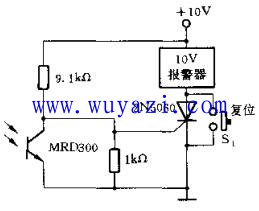 下圖是用晶閘管作驅動器的光控報警器。在有光照時,光敏三極管導通,晶閘管因門極為低電平而呈關斷狀態,報警器不響。當光披遮斷時,光敏三極管截止,輸出高電平使晶閘管導通,報警器嘯叫。為使報警器停止嘯叫,可將S瞬時閉合,使晶閘管截止。