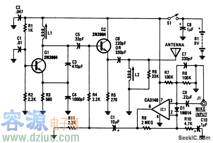 一個運算放大電路(741)放大來自MIC1的聲頻信號,R12控制該電路的增益。音頻信號是供給振蕩器電路Q1和相關的元件。D2是一個變容二極管。給D2的音頻會引起振蕩器信號的調頻。 :