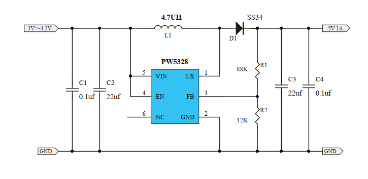 兩款2V升5V的芯片電路圖: PW5100升壓芯