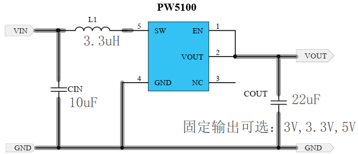 PW5100 是一款效率很大、低功耗、低紋波、高工作頻率的 PFM 同步升壓 DC/DC 變換器。輸出電壓可選固定輸出值,從 3.0V,3.3V, 5.