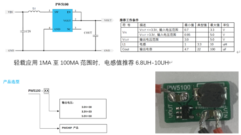 PW5100可以實現(xiàn)2.4V轉3.3V,2V轉3.3V的穩(wěn)壓電源電路,輸出電流500MA.靜態(tài)電流10uA,SOT23-5封裝。輸出紋波低,輕載性能高(輕載電感推薦6.8UH-10UH).PW5100 是一款高
