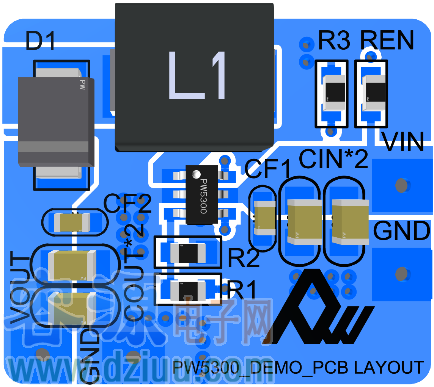 PW5100 的工作頻率高達 1.2MHz,其目的是為了能夠減小外部的電感尺寸和輸出電容容值,故 PW5100 只需要 1uH 以上的電感就可以保證正常工作,