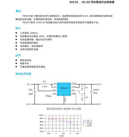 1、PW6276是一顆高效同步升壓轉(zhuǎn)換芯片,內(nèi)部集成低阻抗功率 MOS。 具有短路保護(hù)功能內(nèi)集成軟啟動(dòng)電路,無需外部補(bǔ)償電容,外部反饋網(wǎng)絡(luò)。