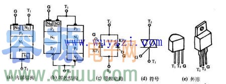 雙向晶閘管是由N-P-N-P-N五層半導體材料制成的,對外也引出三個電極,其結構如圖所示。雙向晶閘管相當于兩個單向晶閘管的反向并聯,但只有一個控制極。