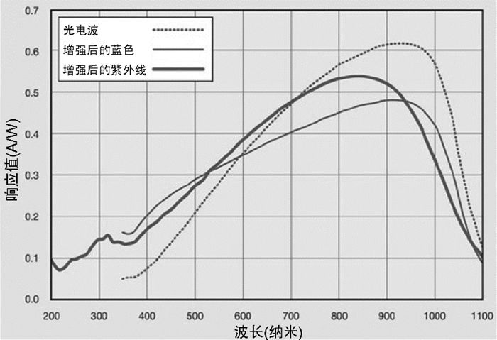 普通成像傳感器采用CCD、CMOS、BSI和Foveon方法進行制造。硅制圖像傳感器具有一個非線性的光譜響應(yīng)曲線,這會很好地感知光譜的近紅外部分,但對藍色、紫色和近紫外部分就感知得不好(如圖2所示)。