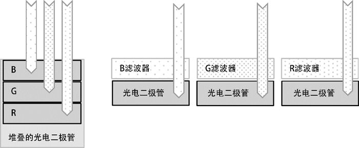 圖4:(左圖)堆疊RGB元件的Foveon方法:在每個元件位置都有RGB顏色, 并在不同的深度吸收不同的波長;(右圖)標(biāo)準(zhǔn)的馬賽克元件:在每個光電二極管上面放置一個RGB濾波器,每個濾波器只允許特定的波長穿過每個光電二極管