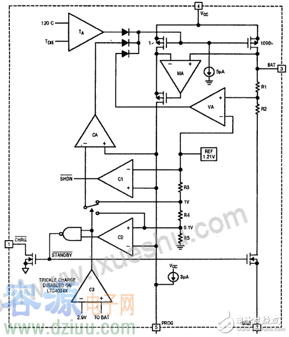 隔離二極管。熱反饋可對充電電流進(jìn)行調(diào)節(jié),以便在大功率操作或高環(huán)境溫度條件下對芯片溫度加以限制。充電電壓固定于 4.2V,而充電電流可通過一個(gè)電阻器進(jìn)行外部設(shè)置。當(dāng)充電電流在達(dá)到最終浮充電壓之后降至設(shè)定值