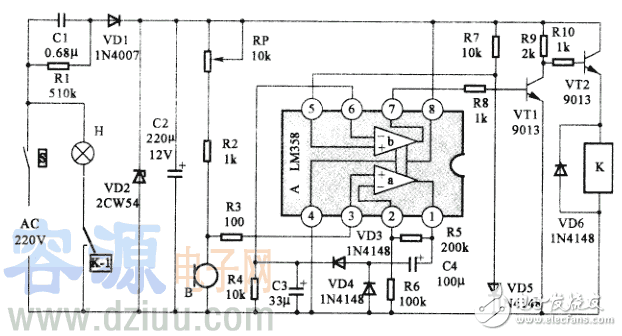 當有響聲時,話筒B便將聲音信號轉換為音頻電信號,經R1送到集成電路LM358的3腳,進人運算放大器a的正向輸入端,經運算放大器a放大后,從a輸出端LM358的1腳輸出音頻交流信號,再經C4、VD3、VD4、C3組成的倍壓整流電路后,變成高電壓信號。由LM358C的6腳送到電壓比較器b的反向輸人端。由于R7、VD5分壓通過LM358C的5腳給電壓比較器b的同向輸入端提供的偏置電壓只有0.7V,就使得比較放大器b的輸出端通過LM358的7腳輸出低電壓,此時的三極管V因無偏置電壓而截止,三極管VT2則由于電阻器R9、R10正偏置而導通電流,電磁繼電器K得電使其中的開關K-2吸合,于是燈泡H點亮。