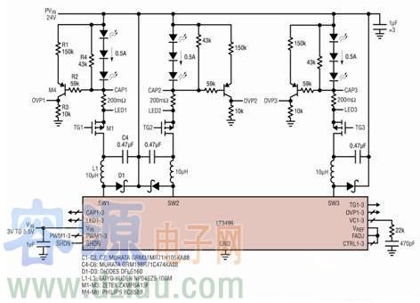 圖 1 示出了采用降壓模式配置的 LT3496 三路輸出 LED 驅(qū)動器,這里,LED串被布設(shè)于 PVIN 和 200mΩ 檢測電阻器之間,以在 PVIN 上實現(xiàn)共陽極連接。這與用于 3 個自由浮動 LED 串的常見降壓模式配置是完全不同的。在標(biāo)準(zhǔn)的穩(wěn)態(tài)操作中,該電路可向每個 LED 串輸送 500mA 的電流。
