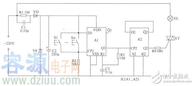 本例介紹一款具有延時(shí)功能的多地控制開關(guān),采用多只按鈕來控制一路照明燈。按動(dòng)任一只按鈕,均可使照明燈點(diǎn)亮,3min左右照明燈自動(dòng)" />