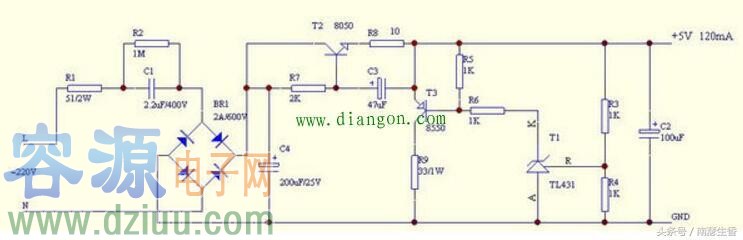 電容降壓的5V直流穩壓電源下面這個電源,最大可以提供約120mA電流: