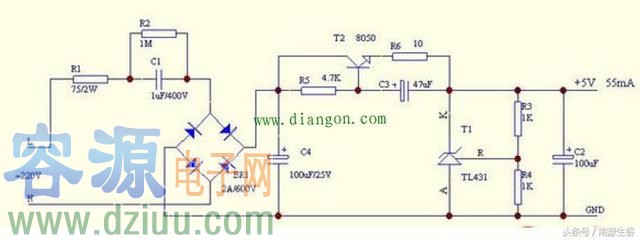 電容降壓的5V直流穩壓電源,下面這個電源,最大可以提供約55mA電流: