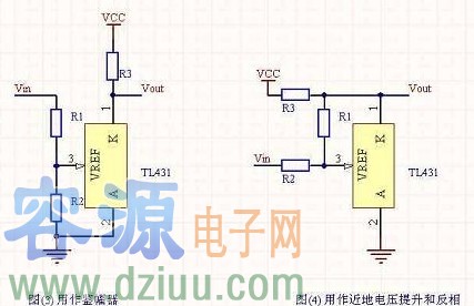 TL431可以用來提升一個近地電壓,并且將其反相。如圖(4),輸出計算公式為: Vout = ( (R1+R2)*2.5 - R1*Vin )/R2.