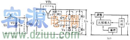 用一個穩壓管和負載并聯的電路是最簡單的穩壓電路,見下圖 (a)。圖中 R 是限流電阻。這個電路的輸出電流很小,它的輸出電壓等于穩壓管的穩定電壓值 V Z 。
