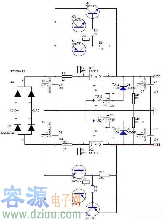 采用三端穩(wěn)壓LM317制作的甲類功放電路