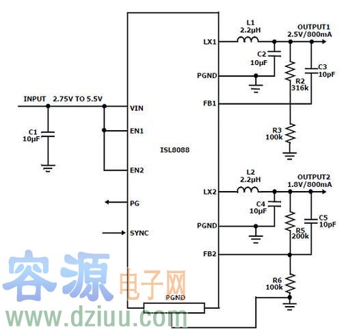 Intersil 公司的ISL8088是雙路800mA低靜態電流高效2.25MHz同步降壓電源穩壓器,電源電壓從2.75V到5.5V,工作頻率2.25MHz,可使用小型低成本電感和電容,每路輸出電壓可低至0.6V,主要應用在DC/DC POL模塊,μC/μP,FPGA和DSP電源,路由器和交換機的插入DC/DC模塊,測試和測量系統,鋰離子電池和條形碼閱讀器。本文介紹ISL8088主要特性以及應用電路,以及ISL8088 EVAL1Z評估板主要特性。