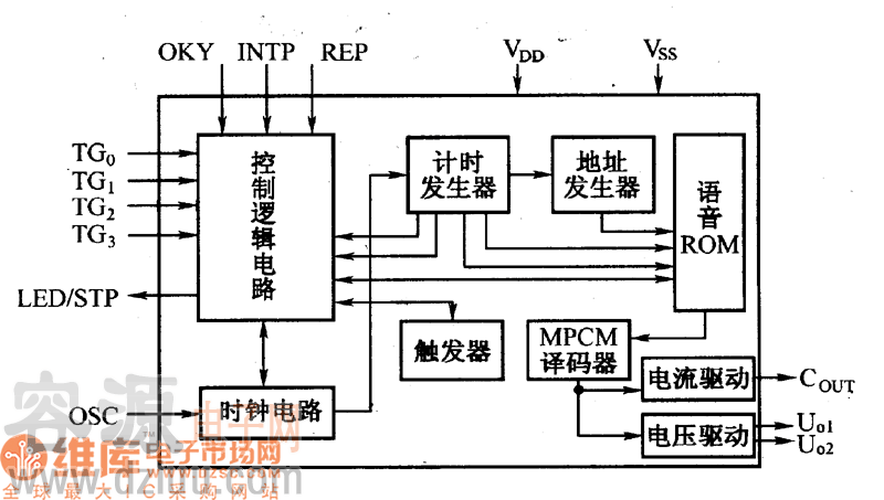 一次性可編程語音集成路是應用自適應脈碼調制語音合成技術的超大規模CMOS集成電路。現以HY061和HY121電路為例,簡要對它的電路原理進行介紹。 HY061和HY121屬于同一類型集成電路,圖是其電路原理框圖。該電路