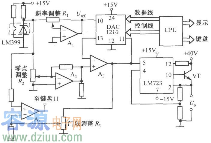 KBC-II型可編程電源由數模轉換器、基準電壓源、電壓比較器、運算放大器Al~A3、輸出電壓可調的穩壓器、CPU、顯示器及鍵盤等幾部分組成,輸出電壓的大小與輸出順序由鍵盤設定,并由計算機控制實現。如圖是這種程控電源的原理電路圖。