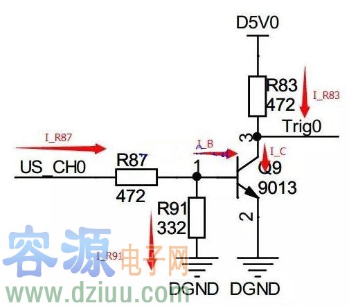 假設沒有R83,當輸入US_CH0為高電平(三極管導通時),D5V0(5V高電平)直接加在三極管的CE級,而三極管的CE,三極管很容易就損壞了。