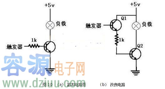 有時(shí)信號源(如正反器)輸出電路之電流容量太小,不足以驅(qū)動晶體管開關(guān),此時(shí)為避免信號源不勝負(fù)荷而產(chǎn)生誤動作,便須采用圖10(b) 所示的改良電路,當(dāng)輸出為高準(zhǔn)位時(shí),先驅(qū)動射極隨耦晶體管Q1做電流放大后,再使Q2導(dǎo)通而驅(qū)動指示燈,由于射極隨耦級的輸入阻抗相當(dāng)高,因此正反器之須要提供少量的輸入電流,便可以得到滿意的工作。