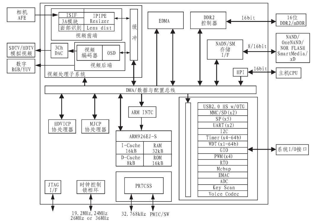 TI公司的TMS320DM365是一款面向多媒體技術應用的高性能芯片。TM320DM365功能框圖如圖2所示。