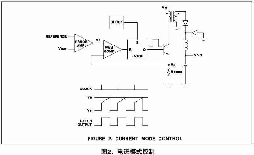 上述缺點比較突出,而且,由于電流模式控制使所有這些缺點均得以減輕,因此它一經推出便引起了設計師們的極大興趣,他們紛紛研究這種拓撲結構。由圖2 給出的示意圖可見,基本的電流模式控制只把振蕩器用作一個固定頻率時鐘,并用一個從輸出電感器電流中得到的信號替代了斜坡波形。