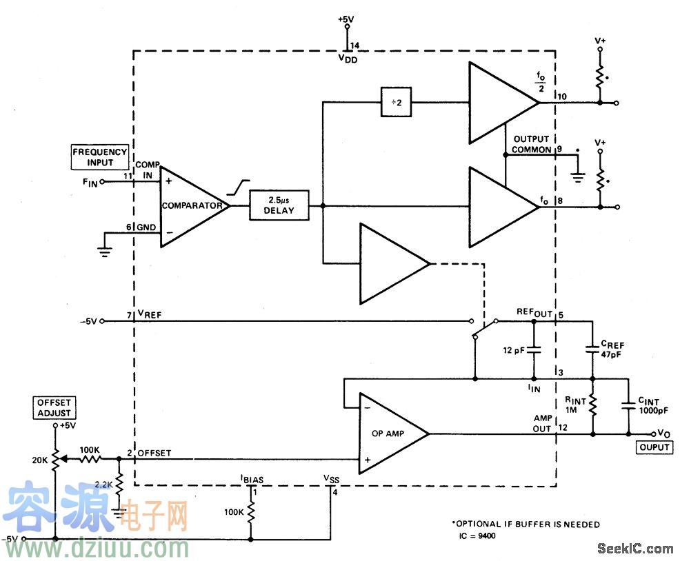 轉(zhuǎn)換器產(chǎn)生一個輸出電壓,輸出電壓是和輸入頻率波形成線性正比。每個在比較器輸入上的過零產(chǎn)生一個精確的變量從而被分配到運算放大器的交界。 :