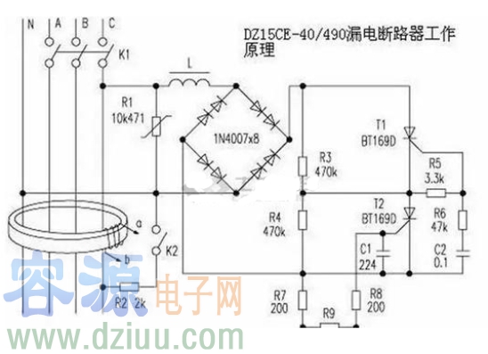 圖中L為電磁鐵線圈,漏電時(shí)可驅(qū)動(dòng)閘刀開關(guān)K1斷開,每個(gè)橋臂用兩只1N4007串聯(lián)可提高耐壓。R3、R4阻值很大,所以K1合上時(shí),流經(jīng)L的電流很小,不足以造成K1斷開。R3、R4為可控硅T1、T2的均壓電阻,可以降低對(duì)可控硅的耐壓要求。K2為試驗(yàn)按鈕,起模擬漏電的作用。按壓試驗(yàn)按鈕K2,K2接通,相當(dāng)于外線火線對(duì)地有漏電,這樣,穿過磁環(huán)的三相電源線和零線的電流的矢量和不為零,磁環(huán)上的檢測(cè)線圈的a、b兩端就有感應(yīng)電壓輸出,此電壓立即觸發(fā)T2導(dǎo)通。由于C2預(yù)先有一定電壓,T2導(dǎo)通后,C2便經(jīng)R6、R5、T2放電,使R5上產(chǎn)生電壓觸發(fā)T1導(dǎo)通。T1、T2導(dǎo)通后,流經(jīng)L的電流增大,使電磁鐵動(dòng)作,驅(qū)動(dòng)開關(guān)K1斷開,試驗(yàn)按鈕的作用是隨時(shí)可檢查本裝置功能是否完好。用電設(shè)備漏電引起電磁鐵動(dòng)作的原理與此相同。R1為壓敏電阻,起過壓保護(hù)作用。