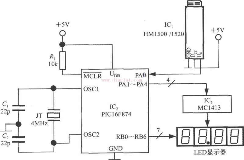 基于PIC16F874設計的電壓輸出式集成濕度傳感器電路如圖。 該儀表采用+5V電源,配4只共陰極LED數碼管。 電路中共使用了3片IC:IC1為HM1500/1520型濕度傳感器,IC2是由美國微芯片公