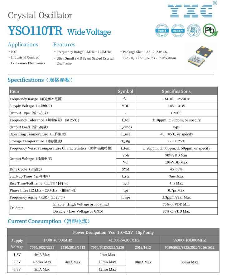YXC晶振YSO110TR系列,頻率為24MHz,總頻差±30PPM,以下為YSO110TR系列規格書。