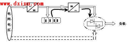 ,負載嚴重過載時,由電網電壓經整流直接給負載供電(如虛線