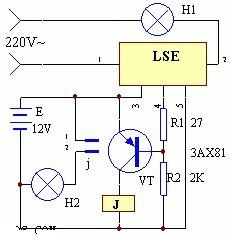 用LSE設(shè)計的電路簡單,實現(xiàn)全自動化。當(dāng)有220V交流電時,照明燈H1點亮,