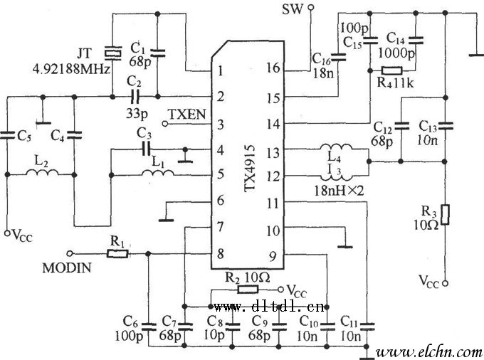 TX4915是一種單片AM/ASK(振幅偏移鍵控)發射集成電路,內部集成了壓控振蕩器(VCO),相位檢波器,分頻選擇器及基準振蕩器晶體管,只要外接一個晶體