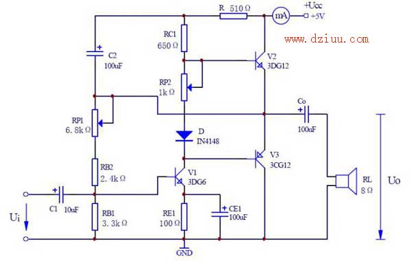 此電路是基本的互補推挽小功率放大器,加上了自舉電路;净パa推挽功率放大器等的知識,本電路輸入電阻小,元器件少,方便制作。