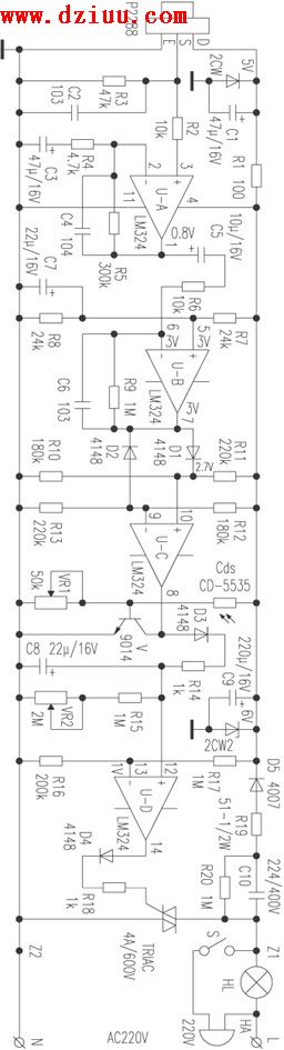 輸出高電位,通過(guò)D3、R14給C8充電,使U-D{12}腳電位高于{13}腳,其{14}腳輸出高電位觸發(fā)雙向可控硅導(dǎo)通,點(diǎn)亮電燈。 <<版權(quán)聲明:本文由容源電子網(wǎng)(www_dziuu_com)整理提供,部分內(nèi)容來(lái)源于網(wǎng)絡(luò),如有侵犯到你的權(quán)利請(qǐng)與我們聯(lián)系更正!