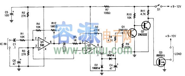 音頻控制開關整合了一對741運算放大器,兩個2N2222