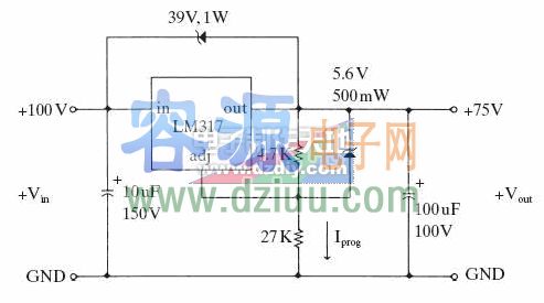 電路,輸入是100V,輸出是75V,LM317居然可以承受這么高電壓,最關鍵是圖中39V的穩壓管,