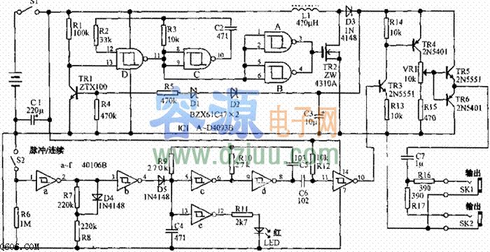 當它的電壓升高到80V時,齊納二極管D1、D2導通。于是TR1導通,將IC1的13腳為低電平,振蕩器即停振并將輸出電壓限制在80V.IC2的六只反相器極其周圍元件組成脈沖發生器,使開關電源產生的80V電壓