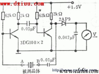 圖示線路當A、B端來接上石英晶體時,萬用表電壓檔指示約為0.75V。當接上石英晶體后,電路應起振,