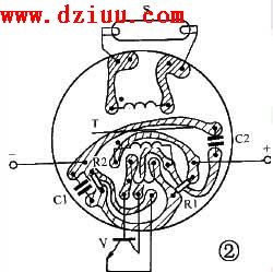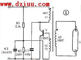 圖中R1為啟動(dòng)電阻使開始時(shí)電路能正常工作。電阻R2為偏流電阻,向三極管V提供一個(gè)合適的基極電流。電容C1為加速電容,用于改善加在三極管V上的脈沖電壓波形。C2的作用是減少加在三極管集-射極上的尖峰電壓,防止三極管被擊穿。