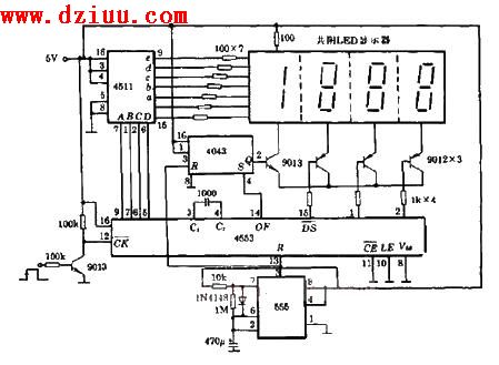 圖中,555用于定時復零,4553是十進三位CMOS計數器,4511是BCD碼七段譯碼器!栋鏅嗦暶鳎罕疚挠蓋ww.zskn.com.cn整理提供,部分內容來源于網絡,如有侵犯到你的權利請與我們聯系更正!