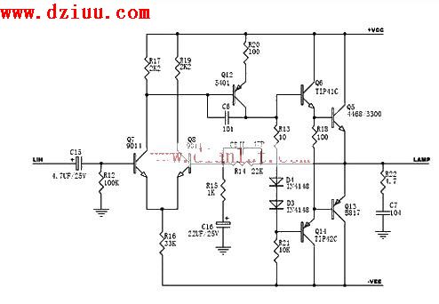 負(fù)反饋電容,滯后補(bǔ)償電容,可以降低Q12的高頻增益,破壞自激的幅頻特性。電阻R22,電容C7可組成一容性負(fù)載,成為揚(yáng)聲器的阻抗補(bǔ)償電路,用以抵償揚(yáng)聲器的感抗成分,是放大器的負(fù)反饋接近于純電子,是放大器工作穩(wěn)定,不易自激,輸出級(jí)晶體管不易出現(xiàn)過(guò)電壓,運(yùn)行比較安全。