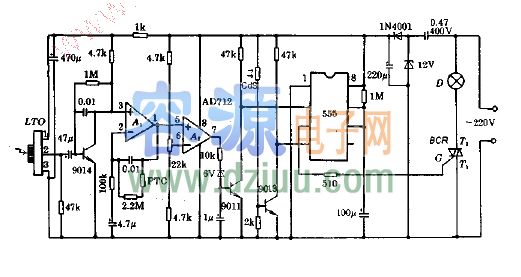 555構成單穩電路,D是受控照明燈。BCR是雙向晶閘管,受555輸出控制。《版權聲明:本文由www.zskn.com.cn整理提供,部分內容來源于網絡,如有侵犯到你的權利請與我們聯系更正。》
