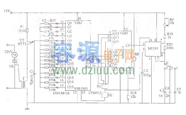 是由12位串行計數器/分頻器CD4040、4位鎖存/4-16線譯碼器CD4514、NE555時基電路、雙4輸入端與非門CD4012等構成的自然風生成電路圖,該電路能模擬出自然風的效果且有定時功能,經常應用于電風扇中。《版權聲明:本文由容源電子網(www_dziuu_com)整理提供,部分內容來源于網絡,如有侵犯到你的權利請與我們聯系更正。》