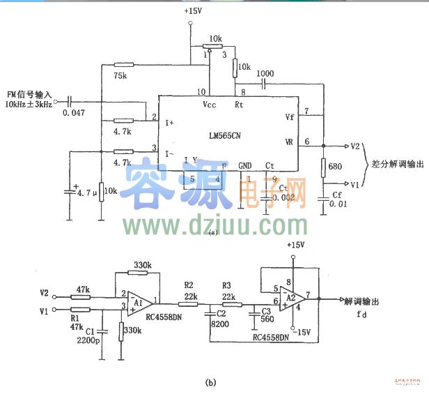 LM565CN、RC4558DN-PLL調(diào)頻解調(diào)器《版權(quán)聲明:本文由容源電子網(wǎng)(www_dziuu_com)整理提供,部分內(nèi)容來源于網(wǎng)絡(luò),如有侵犯到你的權(quán)利請(qǐng)與我們聯(lián)系更正。》