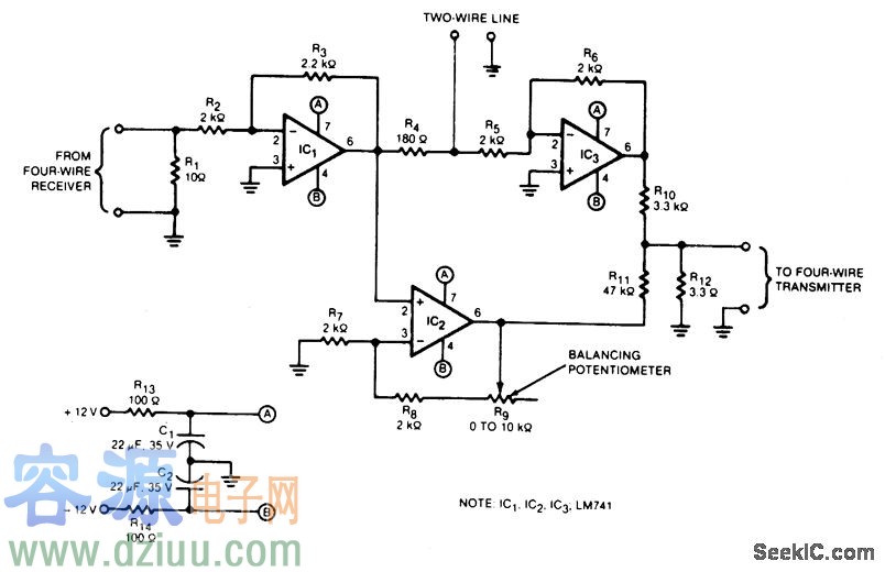 該變頻電路的四線制傳輸線的二分之一處的輸入和輸出之間的隔離音頻是40dB,該電路還需要連接一段雙線制傳輸線。平衡電位計Rg調節IC2的增益,使輸入與輸出之間的導通為零。在四線輸入中插入一個1kHz音調然后設置Rg