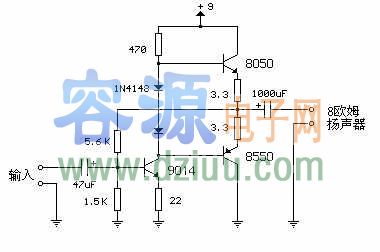 時(shí),輸出三極管發(fā)射極與基極間電壓會(huì)減小,以減小偏流。此電路輸入阻抗為500歐姆,在使用8歐姆揚(yáng)聲器時(shí),電壓增益為5。