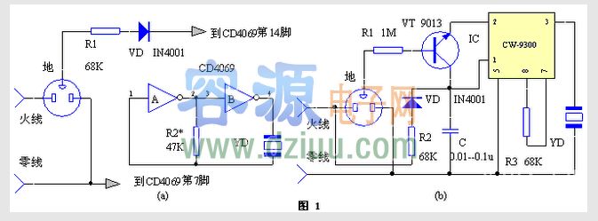 圖(b)采用一片CW9300音樂IC制作的漏電報警器,