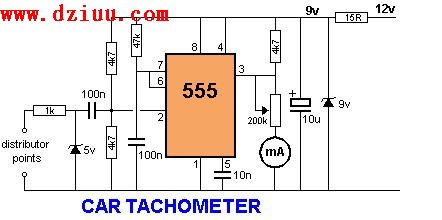 這些是AC耦合 ??的觸發輸入端通過100n的耦合電容。的50毫安米接收的電流脈沖通過的200k鍋顯示讀數。 集成的電流脈沖的汽車發動機速度上產生一個可見的指示,在0-1mA的米。 供應取自汽車部分12v系統和為555它被減少到一個調節9v的由15歐姆的電阻器,在結合的9v的齊納二極管。 <<提示: